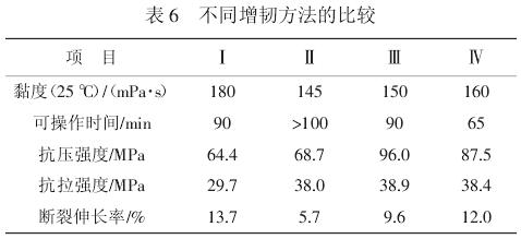 本研究主要采用了增韧剂、柔韧性树脂、柔性固化剂和有机纳米蒙脱土 4 种方法来提高环氧树脂灌浆材料的性能,选取每种方法综合性能最好的一组数据进行比较(见表 6)。