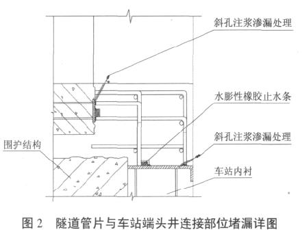裂缝有漏水现象,因此,在灌浆之前先用油溶性的聚氨酯浆液在隧道管片和车站端头接缝处进行灌注,在渗漏水被阻止之后,再采用骑缝灌注亲水性环氧浆液。如果在渗水甚至漏水的裂缝中直接灌注环氧树脂浆液,势必会造成低黏度的灌浆料随着渗漏水流走,因此必须先将渗漏的水堵住。环氧树脂灌浆采用低压、慢速、多次灌注,具体堵漏构造见图 2。