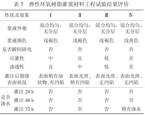 从表7 可以看出,本实验所制备的 4 种灌浆材料混合效果都较好,均无分层现象;有合适的可操作时间,不会发生在灌浆过程中瞬间固化的问题;采用柔性固化剂的Ⅲ号样品的黏度最低,可灌性最好,由于Ⅳ号样品中加入了纳米粉末材料,因此黏度较大,同时由于裂缝小于0.5 mm,相比之下其可灌性最差。当然,在裂缝大于 0.5 mm 时,可以使用添加了纳米蒙脱土的环氧灌浆材料,其修补的裂缝表面光滑,无凹陷,原因是因为纳米粉末材料的加入能很好地降低固化物的收缩率;使用增韧剂的样品,其修复表面有明显的凹陷,说明其固化物的收缩率较大,原因可能是因为增韧剂主要是缩水甘油醚,加入到环氧树脂中与固化剂发生化学反应,其环氧键的反应活性小于环氧树脂的反应活性,因此固化后发生一定的收缩。相比之下,采用柔性固化剂的样品,其黏度较低,适用于修复小于0.5 mm 的裂缝,机械强度很高,同时具有一定的断裂延伸率,表现出较好的柔韧性。通过观察修复后 24、48、72 h的裂缝,Ⅳ号配方所修复的裂缝开始有少量渗水,分析其原因可能是纳米粉末材料的加入导致浆液的黏度有所上升,使浆液在混凝土表面的润湿性能有所下降,同时本试点工程的裂缝均小于 0.5 mm,纳米粒子虽然粒径远远小于缝隙的宽度,但是不可避免的是众多粒子之间团聚,导致可灌性不佳,最终导致修复效果不好;观察Ⅰ、Ⅱ、Ⅲ、Ⅳ号表面均无渗水,修复效果较好。