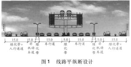 成都地铁 2 号所处的龙工北路西延线,从节约用地的角度出发,路中绿化带规划宽度为 5 m,两侧设置双向 8 车道的机动车道,红线宽 50 m,绿线宽80 m,故本线采用路中单柱墩架空设置的高架车站,并以满足梁下道路净空不小于 5. 5 m 的要求,从而确定车站及区间高度。( 见图 1)