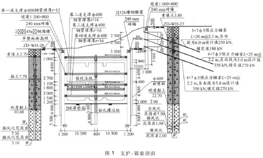 ( 1) 车站西侧 100 m 为平南铁路桥,北侧沿布龙路方向有一条直径 600 mm 的 LNG 高压燃气管线,经调查无法迁改。受此条件限制结合布龙路、五和立交改造情况,站位布设于五和立交桥辅道下,站位空间紧张。车站与桥台最小净距仅为1. 8 m,引桥桥面高出基坑顶 10 m 以上,使基坑偏载情况严重,对引桥方向围护采用( 4 × 75 预应力锚索) 加强措施( 见图1) ,严格控制沉降。并结合市政规划,利用主体上方覆土空间夹层设置 1、2 号风道及消防疏散口,在保证功能的前提下大大降低了施工难度及造价。