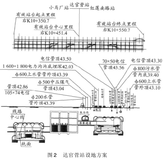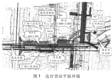 北京地铁 16 号线达官营站位于广安门外大街和三里河南延路交叉路口的北侧,与在建的 7 号线换乘。路口的北侧主要为高层住宅,国家话剧院,南侧为莲花河,河边有一个加油站和一公交车场。广安门外大街为北京东西向的主干路,车流量非常大,沿广外大街路下有5 000 ×3 000 的热力沟,沿三里河南延路下有 3 400 ×2 300 的污水管沟,路中有110 kV 的高压塔线。7 号线车站由于受广外大街交通及路下热力、电力管线的影响采用暗挖。受 7 号线轨面及站前河道的影响,16 号线需下穿 7 号线,因此车站轨面埋深很深( 见图 1) 。