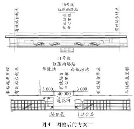 方案二( 如图 4) ,16 号线两个区间分别设在河道的两侧,车站则采用分离岛式,为避免改移管线和古树车站也采用暗挖法施工。11 号线下穿 16 号线采用岛式车站,跨河设置,采用暗挖法施工,两线形成双“十”字换乘,该方案两条线对河两侧的客流吸引均较均衡,且换乘点较多,能组织单向换乘。综合各方面的因素,确定采用分离岛方案