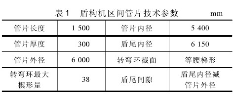 根据线路转弯半径确定直线环、转弯环大致比例原则: 对于线路存在水平、竖直曲线的路段,管片选型前首先要根据线路情况通过 CAD 软件拟合线路,确定直线环、转弯环大致比例,以及曲线段上标准环与转弯环的布置方式,曲线段施工时,采用标准环与转弯环配合。在施工过程中选择管片时应尽量维持此比例。盾构机区间管片技术参数见表1。