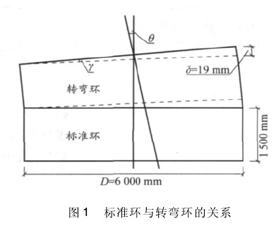 由此式表明,在650 m 的圆曲线上,每隔4.117 m要用一环转弯环,由于管片长度为 1. 5 m,因此,在650 m 的圆曲线上,标准与转弯环的拼装关系为 3 环标准环 +1 环转弯环。