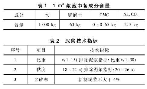 选用优质膨润土造浆,泥浆比重控制在 1. 15 ~1. 3 范围。试验泥浆的全部性能指标,并在钻进中定期检验泥浆比重、黏度、含砂率、胶体率等,填写泥浆试验记录表。泥浆循环使用,废弃泥浆沉淀后运至车辆段进行处理。泥浆的主要成分: ( 1) 膨润土: 国产Ⅱ级钙土; ( 2) 水: 自来水; ( 3) 分散剂: 工业纯碱( Na2CO3) 。另外,掺加中黏度羧甲基纤维素( CMC) 增粘剂,以降低失水量,提高泥浆黏度和泥皮能力,改善流变性能和悬浮小岩石颗粒的能力。1 m3新鲜泥浆的成分见表 1,泥浆技术指标见表 2。