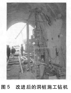 由于此工程暗挖断采用洞桩施工,导洞为 4 ×4. 6 m 马蹄形断面,有效净高仅为 4. 2 m,施工空间狭小,一般钻机高度均大于导洞净高,无法进入导洞进行洞桩施工。因此,对 GSD-50 型大口径全液压反循环钻机( 工作时外形尺寸 5. 3 m × 2. 07 m ×4. 7 m) 进行了改装,将底座和钻塔外形按比例进行了收缩,底座安装了轨轮便于移动,钻塔的高度由原来的 4. 7 m 降为 3. 5 m,使其能满足导洞内施工限界( 见图 5) 。该钻机已申请国家实用新型专利( 《富水砂层浅埋暗挖地铁车站洞桩机械施工方法》专利号: 201110403221. X) 。