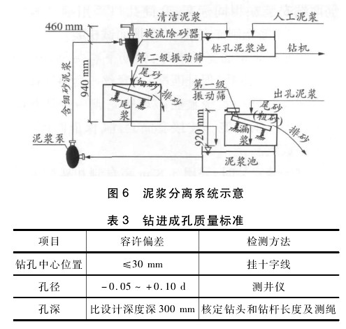 钻孔采用膨润土造浆护壁,泥浆循环回转法成孔,自行设计泥浆造浆存放、分离、回浆等系统( 见图 6) ,满足了洞内文明施工的要求,大大减小了泥浆对环境的污染程度。较传统泥浆池大大提高了泥浆利用率,实现洞桩绿色施工,并申请国家实用新型专利( 富水砂层浅埋暗挖地铁车站洞桩机械施工用泥浆分离系统》专利号: 201120517478. 3) 。钻进成孔质量标准见表 3。