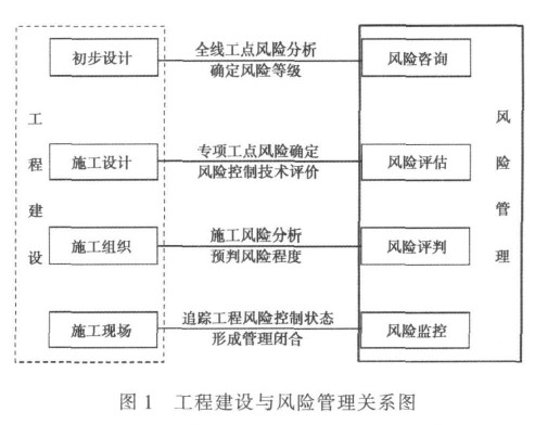 工程风险是在工程建设过程中产生的,始终贯穿于整个工程建设的全过程,当工程建设进入一个环节,风险管理工作自然进入相应的工作关键点,但风险管理工作是一个系统工程,而不仅仅属于某个单项环节的范畴。 整个工程建设环节与风险管理关键工作之间的关系如图 1 所示。