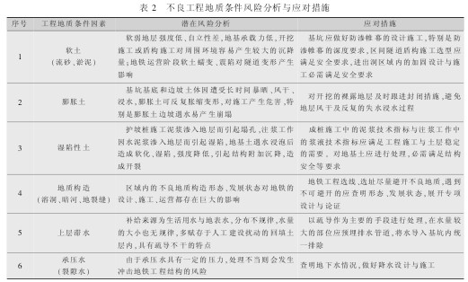 地铁修建与区域内的工程地质条件具有紧密的联系。 对地铁工程影响的特殊土质,如软土、膨胀土、湿陷性土;地下溶洞、暗河、地裂缝等地质构造特征[7-10];地层的物理力学工程特性,地下水性质等缺陷都对工程产生一定的风险。 主要的工程地质条件风险和应对措施如表 2 所示。