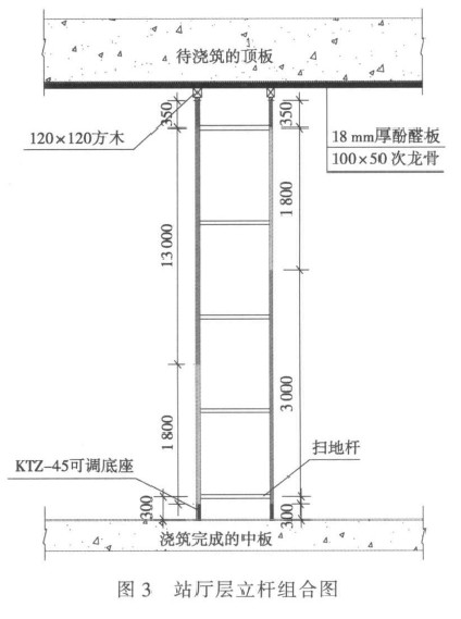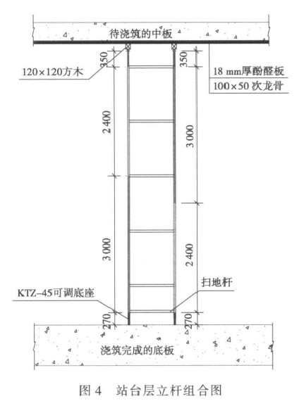 以车站结构标准断面为例,结构模板支立时,顶板向上外放 3 cm,站厅层高度 5.58 m,采用 HG-300 立杆和 HG-180 立杆组合搭设,立杆组合搭设如图 3 所示。站台层高度 6.25 m,采用 HG-300 立杆和 HG-240 立杆组合搭设,立杆组合搭设如图 4 所示。