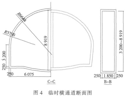 根据以上的分析结果,对于竖直方向考虑采用暗挖扩挖的方式。 依据现场施工条件及施工经验确定过渡长度为 3 m,每 m 抬升隧道拱顶约 60 mm。考虑到全部进行扩挖施工难以实施,确定将标准段向大断面一半的洞型进行过渡施工,结合竖直方向的扩挖施工,完成 3 m 的暗挖过渡后再按照大断面一半的洞型进行返挖,而后在形成的一半洞型内向另一侧施工横向通道。为降低工程造价,该横通道纵向剖面按照大断面的一半洞型进行设计。 考虑到横通道完成后,按照大断面的暗挖施工步序进行施工时,需破除横通道的两侧初衬,该范围存在初衬结构失稳的问题,因此,将设计横通道的初衬外放 30 cm,使横通道纵向初衬结构内轮廓线与大断面设计初衬外轮廓线重合,在完成横通道后,在横通道内将另一半大断面初衬完成并形成闭合的初衬结构,完成受力转换。