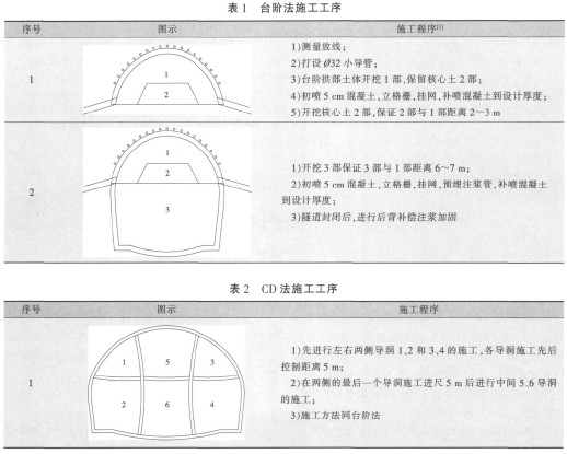 区间标准断面和临时横通道采用台阶法施工,渡线段大端面开挖采用 CD 法施工,施工工序分别如表 1、2 所示。