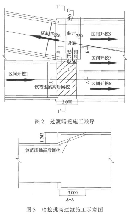 标准段向大断面挑挖施工过渡范围的确定是保证施工安全的重要技术环节,需要根据土质情况、作业人员技能、每循环进尺的时间进行确定;在过渡范围需要加密格栅,缩短围岩暴露时间;通过临时横通道初支结构的外放,为大断面初衬横向闭合成环完成受力转换提供空间,保证后续施工的安全进行,这是过渡段施工技术要点。
