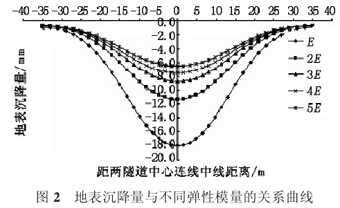 下面就弹性模量对地铁隧道开挖引起的地表沉降进行敏感性分析,如图 3。