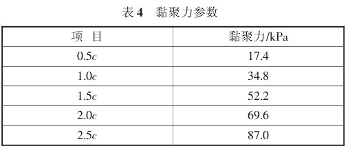 考虑到该黄土地区地铁 2 号线通过的所有地层参数,对黏聚力 c 进行了 0.5c、1c、1.5c、2c、2.5c 五种参数下的数值分析,具体参数取值如表 4。