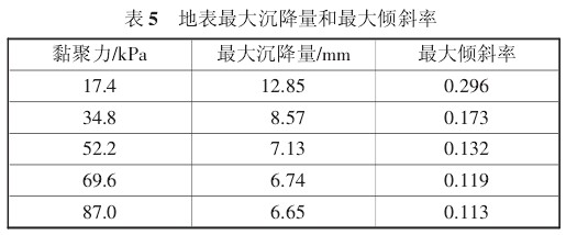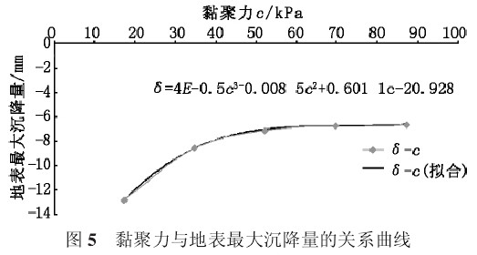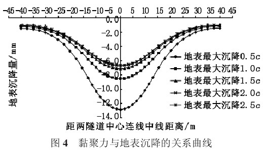 下面就黏聚力对地铁隧道开挖引起的地表沉降进行敏感性分析,如图 5。