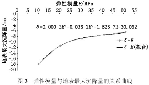 从图 3 中可以明显看出,弹性模量为压缩模量1 倍到两倍这个区间段,地表沉降量随弹性模量的变化曲线斜率较大,说明在这个区间段地表沉降量受弹性模量的影响比较大,即反应比较敏感,表现为弹性模量越大,地表沉降量越小;过了两倍压缩模量后曲线变的平缓,这个区段地表沉降量对弹性模量的改变敏感性较弱。根据曲线拟合,可以得到地表沉降量随弹性模量的关系式为: