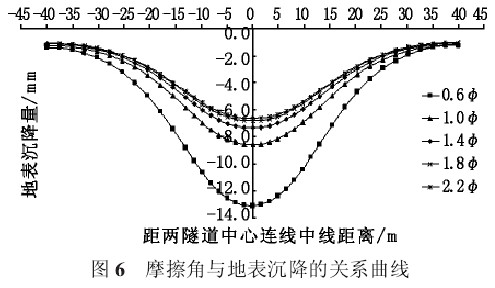 分析其地表沉降变化规律时,选取了隧道双线挖通后地表沉降量最大的断面,其横断面沉降随摩擦角的变化规律如图 6 所示。