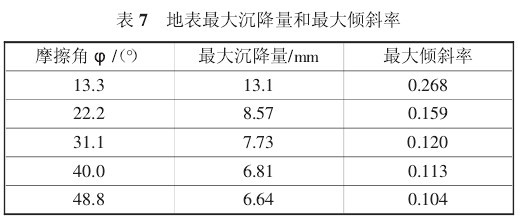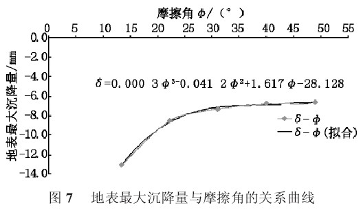 图 7 很清楚地表明,地表最大沉降量随摩擦角变化有两个阶段,摩擦角从 13.32°到 22.2°增大的过程中,曲线的斜率较大,这说明地面沉降量的减幅相对较大,也就是说在这一区域地表最大沉降量受摩擦角的变化反应比较敏感;之后曲线变得比较平稳,最终趋于水平。本文大致拟合了它们之间的关系式为: