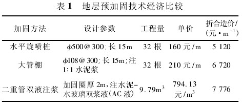 采用以上 3 种方法加固地层,折合成隧道每延米造价的经济比较如表 1 所示。