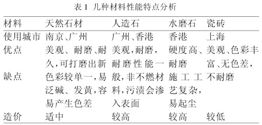 可用于地铁车站、并已具备使用经验的地面材料主要有天然石材、人造石、水磨石、瓷砖这四种,对几种材料性能特点分析如表 1 所示。