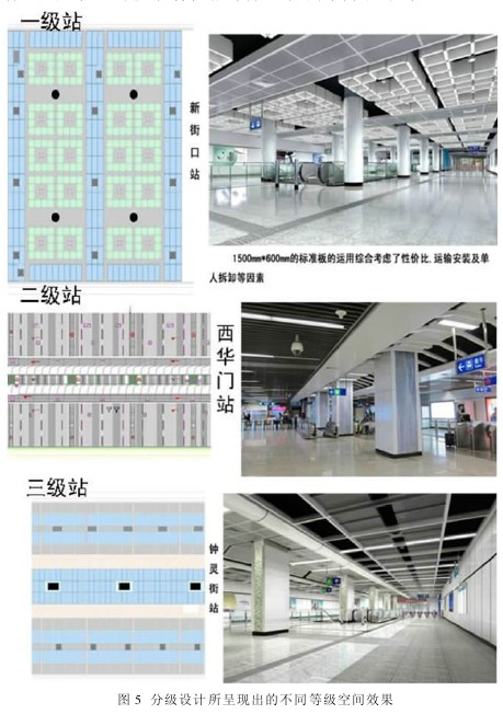 分级设计是根据客流量、车站所处区域重要性,对装饰效果、装修材料选择进行分级,以实现标准化和个性化的平衡、整体效果与投资的平衡的一种设计手法。二号线车站划分为三级: