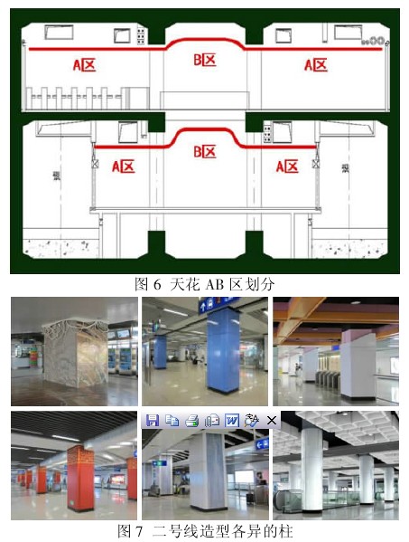B 区为重点表现区域,二号线管线综合设计时将各类管线集中到车站的两侧A 区吊顶内,B 区吊顶内管线较少,为天花局部抬高、进行造型处理提供了条件,装饰手法主要结合区域文化特征,采用抽象符号或装饰性较强的造型,增加公共空间的整体感、层次感、识别性。