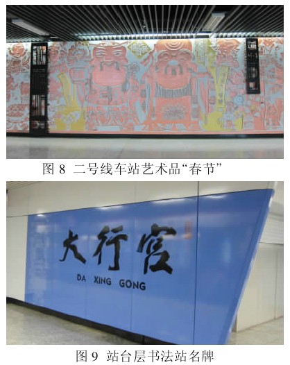 ①主题统一的公共艺术品。在车站内设置公共艺术品也是南京地铁传统特色之一。二号线艺术品突破了我国公共环境艺术品一地一景、主题单一地与所在地的历史文脉、环境特点及重大事件相联系的套路,采取了以中国法定传统节假日为全线系列创作主题方式,如图 8 所示,这样既弘扬了中国传统民族文化,也使得车站环境氛围更加愉悦、欢快。