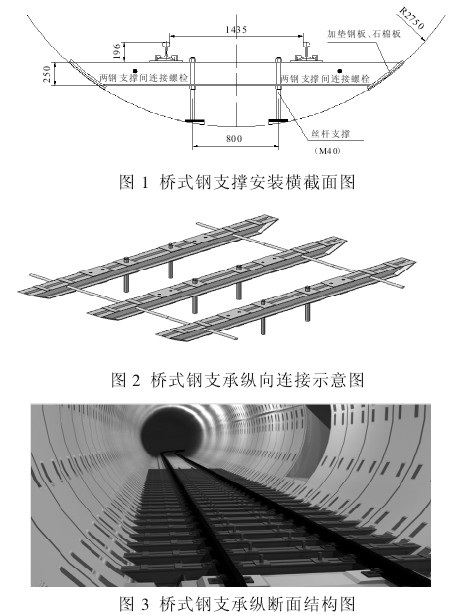 在城市轨道工程施工中,由于隧道旁通道地段结构工后沉降较大,为消除或减轻旁通道地段施工因隧道结构沉降不稳定对轨道结构平顺度造成的影响,在隧道旁通道前后各30m 范围内采用临时过渡的施工方案,主要是使用桥式钢支承进行临时过渡施工,确保施工车辆在限速情况下安全通过,待结构沉降稳定后再浇筑整体道床混凝土。下面针对桥式钢支承设计及应用技术详述如下: