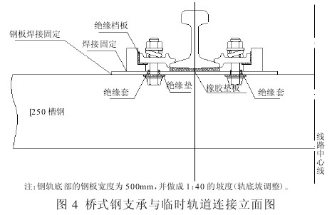 根据施工经验建议采用扣板式扣件将钢轨连接在桥式钢支撑上,同时在扣件与挡板座之间、螺栓与[250 槽钢之间加绝缘垫或绝缘套,轨底设橡胶垫板,这样不仅解决了轨道的稳定性的控制,而且达到绝缘效果,同时通过轨距挡板号码(宽度)、轨底橡胶垫板厚度可以有效的对轨道中线(方向)和水平(高低)进行调整,有效的保证轨道几何状态的控制。桥式钢支承与临时轨道连接如图4。
