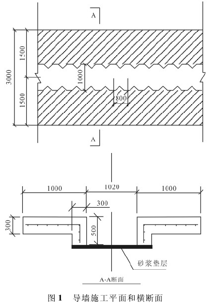 为了提高钻孔咬合桩孔口的定位精度并提高就位效率,在桩顶上部施作混凝土导墙或钢筋混凝土导墙,这是钻孔咬合桩施工前必须具备的首要条件,也有利于钻机安装及作业的稳定。导墙平面、横断面图示见图 1。