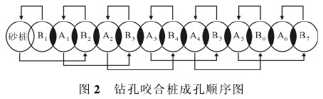 首先定义 A 桩为钢筋混凝土桩,B 桩为素混凝土桩。在一段连续的施工段上钻孔咬合桩的成孔原则是: 先施工 B 桩,灌注素混凝土,再在相邻两 B 桩间切割超缓凝素混凝土 B 桩成孔施工钢筋混凝土 A 类桩。其成孔顺序为: B1→砂桩→B2→A1→B3→A2→B4……Bn→An - 1→砂桩,见图 2。