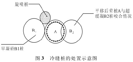 施工钻孔咬合桩,造成冷缝的原因主要有: 前文中提到的施工组织原因形成的砂桩一侧的素桩,在最后接头处施工时早已凝固的冷缝; 由于 C20 超缓凝混凝土本身不稳定所造成的一边出现早凝现象,而在其后进行中间荤桩施工时对早凝一侧不能正常的割切,必须进行桩位偏移处理,从而造成的冷缝事故桩。不管是第一种还是第二种情况,基本的处理原则是采取平移荤桩,早凝边相接缓凝边切割,相接边采用高压旋喷桩止水的措施,见图 3。