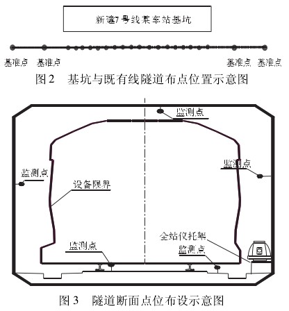 以某城市已运行的既有地铁线 2 号线为例,其临近位置有新建线路地铁 7 号线的一个车站基坑进行施工作业,车站基坑距离既有线隧道最近位置约为 6 m,因此在7 号线车站基坑施工期间采用自动化监测方法对既有线隧道受影响区域进行自动化监测。