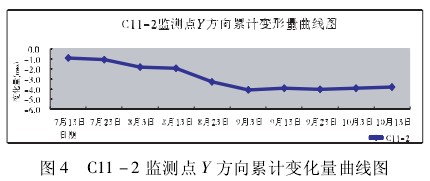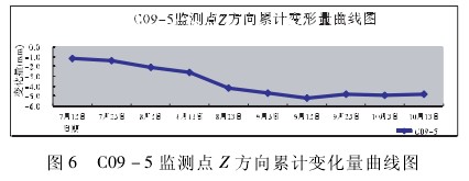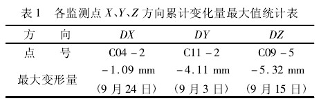 由表 1 可以看出,X 方向累计变化量最大为 -1. 09 mm,Y 方向累计变化量最大为 - 4. 11 mm,Z 方向累计变化量最大为 -5. 32 mm,因此整个自动化监测过程中各方向最大累计变形量均不超过 ±14 mm,即没有超过设计警戒值。