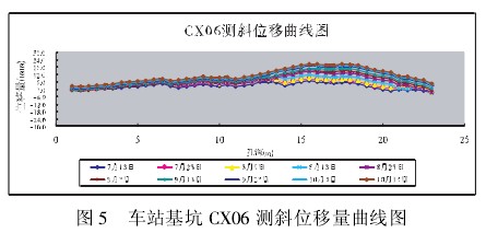 C11 - 2 监测点位于断面 11,断面 11 位置对应于7 号线车站基坑的中部,与断面 11 位置相当的车站基坑测斜孔为 CX06,因此选取与 C11 -2 点相同日期的CX06 号测斜孔 10 天的测斜数据,如图 5 所示,正值表示向基坑内移动,负值表示向基坑外侧移动。