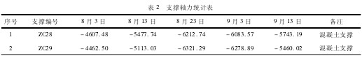 既有 2 号线隧道 C11 - 2 点的大致埋深位置约为 18 m,7 号线车站基坑的深度为 19 m。由图 4 可以看出,从 8 月 13 日到 9 月 3 日,C11 -2 点在 Y 方向上有明显偏向于基坑方向的位移,之后数据趋于稳定。从图 5 可以看出,随着基坑的不断开挖,CX06测斜有明显偏向基坑内侧的位移,这与 C11 -2 监测到变化趋势在方向上一致,从8 月10 日到9 月1 日,基坑开挖范围为 13 ~19 m,在这段时间内测斜 CX06在 15 ~ 20 m 的监测范围内变化明显。因此可以看出,自动化监测到的变形趋势和基坑测斜监测到的变形趋势,在时间和空间上基本吻合,为了更进一步验证,列举 8 月 3 日至 9 月 13 日基坑 CX06 测斜附近的第二道支撑轴力,如表 2 所示。