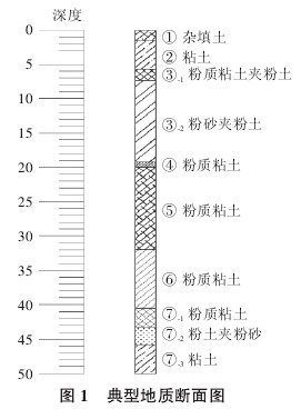 对工程有主要影响的地下水: ①层中的上层滞水及潜水,该含水层流通性差,水位标高在 0.2 ~0.7 之间; ③-1层粉质粘土夹粉土层,③-2层粉砂夹粉土层组中的微承压水,稳定水位在 -0.5 m。典型的工程地质断面如图 1 所示。