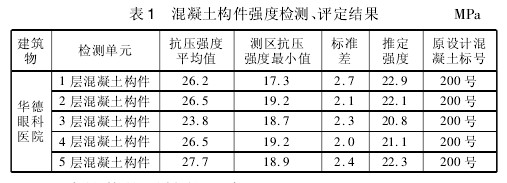检测以回弹法为主,在具备检测条件的部位,对楼房中的砖砌体构件、砂浆和砖进行回弹测试,对砌筑砂浆测试其碳化深度;对于楼房中的混凝土构件,主要是选在楼梯间,对混凝土框架梁、框架柱、圈梁及构造柱等构件,选取有检测条件的区域,采用回弹法对混凝土强度等级进行抽样测试,打开抹灰层,对混凝土强度进行回弹检测,并测试其碳化深度( 见表 1) 。