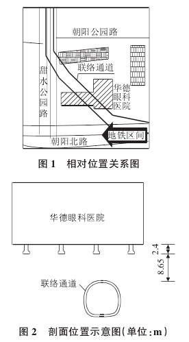 北京地铁十四号线甜水园站—朝阳公园站区间与地铁六号线之间的联络通道在华德眼科医院正下方穿越,通道采用暗挖法施工,隧道顶与华德眼科医院净距 8.56 m,华德眼科医院建于1979 年,为 5 层砖混结构,无地下室,建筑面积约 4 766 m2。相对位置关系图及剖面位置示意图见图 1,图 2。