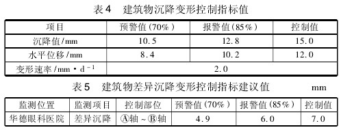 依据其他类似工程经验和现场监测数据,在综合考虑建筑物现状调查、检测成果和剩余允许变形能力计算的基础上,考虑一定的安全系数,既有建筑物沉降变形控制指标建议如表4,表5 所示。