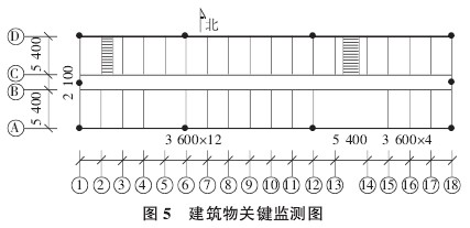 地铁十四号线下穿该建筑物,建筑物的内墙、外墙均距离此次地铁施工的隧道边缘很近,地铁施工时需要予以重视,加强楼房现有裂缝和沉降观测。建议充分考虑该建筑物的现状和使用特点,综合考虑技术、经济以及地铁线路建设要求,制定妥善、可行的施工和监控方案,采取有效、可靠的措施,确保该建筑物的安全和地铁施工的正常进行。根据上述计算分析结论及相关工程经验,建议如下: 1) 施工前,应对建筑物基础及上部结构建立严密的监测网,实施连续监测( 见图 5) ; 2) 做好工程筹划,保证连续作业,从而减小对既有建筑物的影响; 3) 建立监测预警系统,进行信息化管理; 4) 加强对建筑物周围地下管线调查监测,如有渗漏处,应做好地层注浆,确保建筑物地基稳定; 5) 施工前,针对既有建筑物实际情况制定专项方案及应急预案。