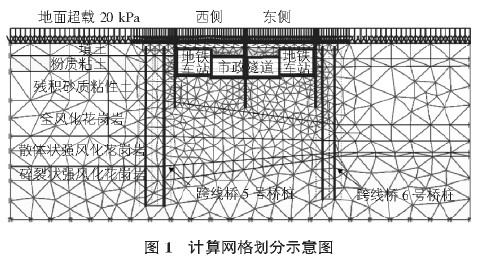 某城市轨道交通1 号线一期工程试验段工程包含2 站1 区间,其基本走向为南北走向,沿城市主干道敷设,线路全长 1. 187 km,均为地下线。本文研究对象为其中一座地铁车站,地下一层车站,正上方为跨线桥。受市政下穿隧道及跨线桥桩基影响被分为东西两部分,为分离侧式车站,需与下穿隧道工程同期设计同步实施。地铁车站及下穿隧道总宽度达 43 m,基坑开挖对跨线桥桩基础会产生不利影响。选取地铁车站、市政隧道及跨线桥桩基等作为分析对象,建立土—结构相互作用计算模型分析基坑开挖卸荷对跨线桥桩基的影响。