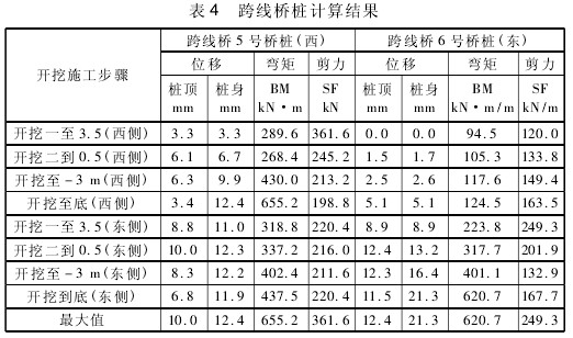 跨线桥桩计算结果见表 4。表中的弯矩及剪力已从每延米值按桩间距转成了单桩值。可以看出,在整个施工过程中,西侧跨线桥 5 号桥桩桩顶和桩身最大位移分别是 10 mm 和 12.4 mm,最大弯矩和剪力分别是 655.2 kN·m 和 361.6 kN。东侧跨线桥6 号桥桩桩顶和桩身最大位移分别是 12.4 mm 和 21.4 mm,最大弯矩和剪力分别是 620.7 kN·m 和 249.2 kN。桥桩的最大竖向位移为 4 mm。根据收集的资料,1 300 mm 直径 5 号桥桩和1 200 mm 直径 6 号桥桩主筋 24Ф25,箍筋Ф10 @100; 经承载力验算,5,6 号桥桩都是安全的。