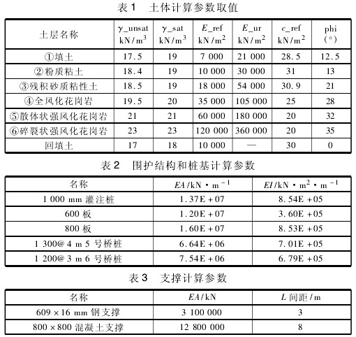 采用岩土专业有限元软件建模计算分析,运用较真实地反映土体开挖卸荷的 HS 硬化土体本构模型以及按照实际的施工工序进行模拟分析。计算模型边界取基坑两侧边线各50 m,高55 m 范围。模拟对象为各土层、围护桩、支撑、主体结构及离基坑两侧最近的 5,6 号跨线桥桩等,5 号桥桩由 6 根 1. 3 m 的桩组成,6 号桩由4 根1. 2 m 和1 根2. 5 m 的桩组成。计算时采用15 节点三角形单元模拟土体; 用板单元模拟围护桩挡土墙; 挡土墙两侧与土的接触面用 10 节点无厚度接触面单元模拟; 横向支撑可以看作弹性杆件。在计算中把围护桩按侧向及轴向刚度等效成连续墙进行分析,跨线桥的桩基础也按同样的方法等效成连续墙。