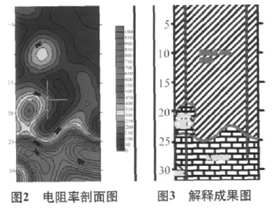 6)数据反演处理和定性 将2次测得的大量数据利用2.5维反演软件直接生成电阻率剖面图(图2),结合钻孔地层情况,以岩体的电性差异为物理基础判断是否存在孤石。然后绘制出超高密度电阻率剖面图和解释成果图(图3)。