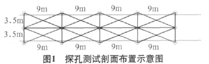 2)探孔布设 横向以3.5m线间距,沿盾构掘进方向平行布置3条探测线,孔距为9m(图1)。