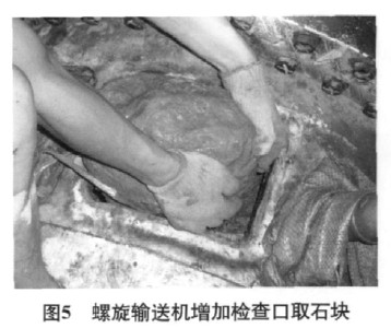 2)螺旋输送机增加检查口 在切割螺旋机处增设检查口(图5)。右线盾构螺旋机上多增设3个检查口,确保能及时清除少量堵塞的石块。