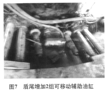 5)增加两组可移动式辅助油缸 由于孤石群地层多数位于高水压砂卵石地层,当隧道下半部为基岩,上半部为砂卵石,盾构离开基岩时,出现刀盘底部为砂卵石、上半部为孤石,这种情况容易出现磕头。因此,在盾尾下部增加2组辅助油缸(图7)实现纠偏。当从孤石群进入基岩,容易发生抬头,在盾构顶部增加2组辅助油缸,利用法向应力确保盾构姿态。该地层也容易出现左侧为基岩、右侧为孤石群或相反情况,此时要在孤石群一侧增加2组辅助油缸实现纠偏。